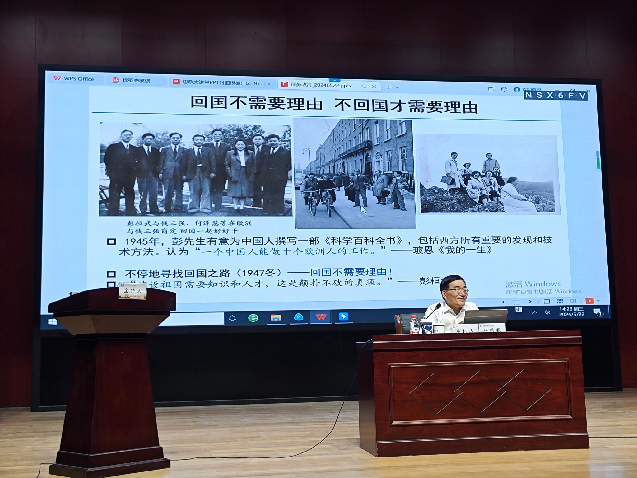 5月22日,校长蔡荣根院士在忻元甫报告厅以“弘扬科学家精神——以彭桓武先生为例”为主题,为物理科学与技术学院和阳明学院440余名师生讲授“形势与政策”课。