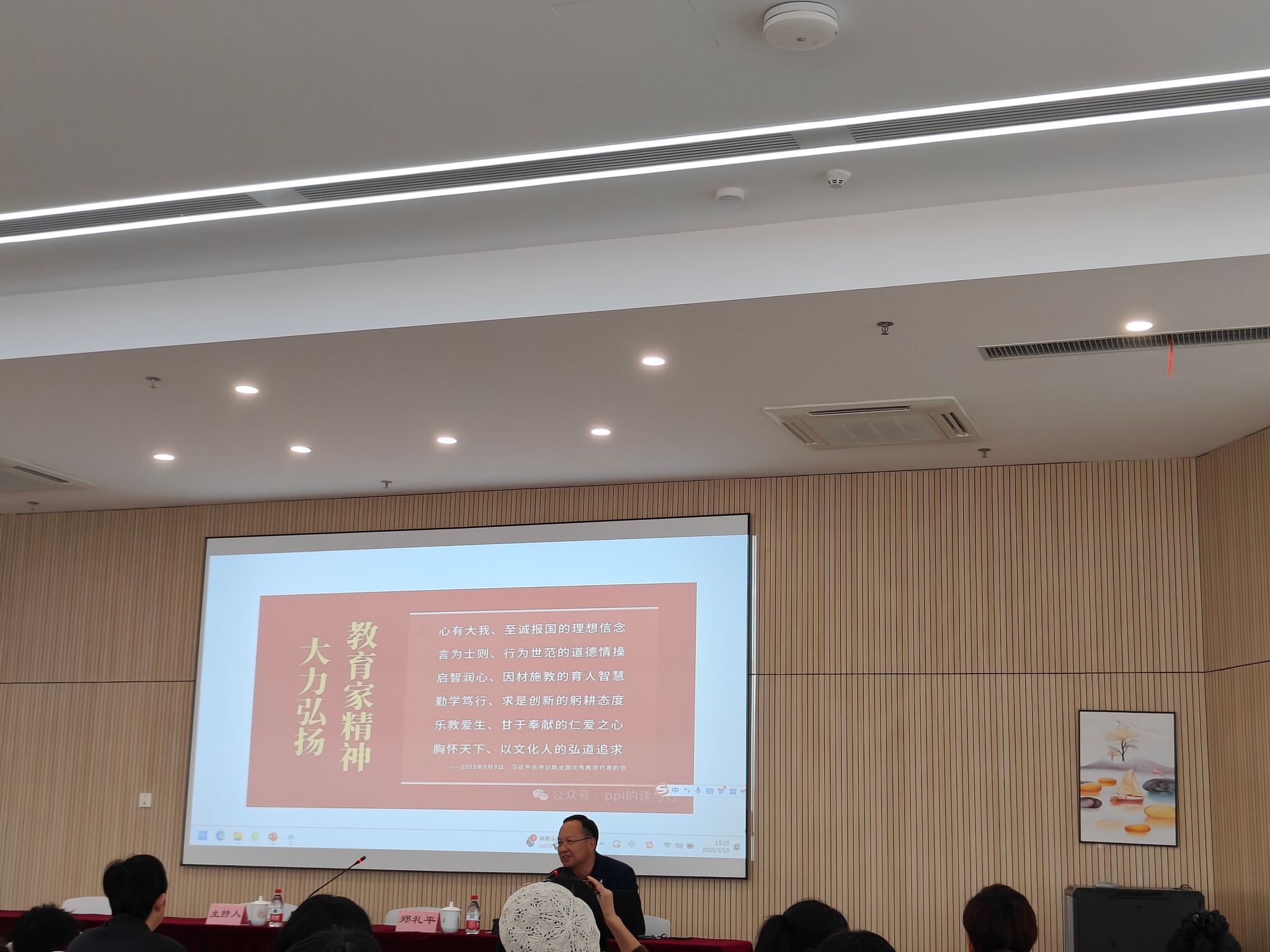 为大力弘扬教育家精神,推动新时代高素质教师队伍建设,3月19日,“五老”师德宣讲团教师郑礼平研究员受邀在潘天寿艺术教学楼213报告厅作题为《以教育家精神引领高素质教师队伍建设》的专题讲座。本次活动由体育学院、潘天寿建筑与艺术设计学院、物理科学与技术学院和数学与统计学院联合举办,吸引了百余名教师到场聆听,现场气氛热烈。