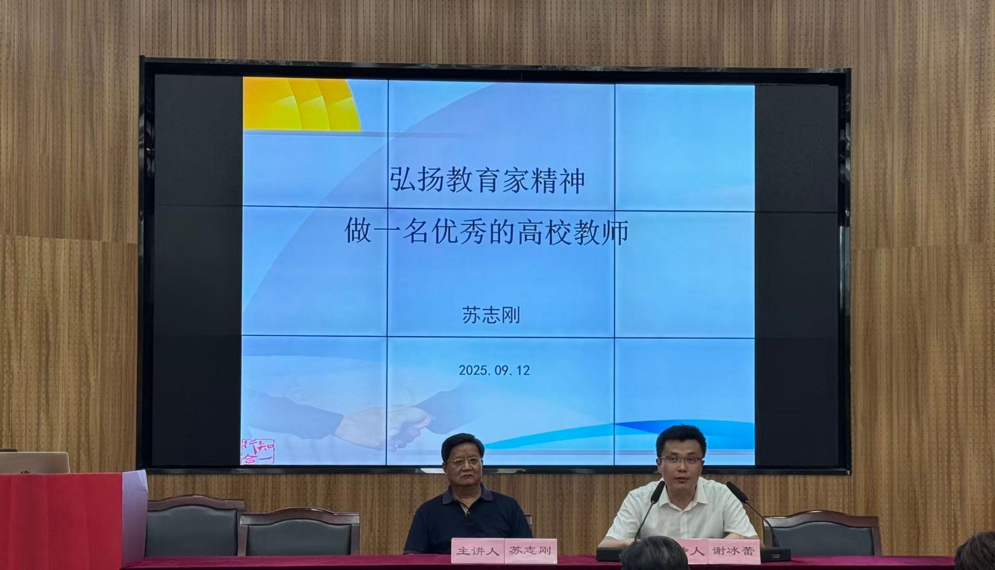 为庆祝第41个教师节,弘扬教育家精神,加强新时代高素质专业化教师队伍建设,9月12日,由学校人事处、党委人才办主办,潘天寿建筑与艺术设计学院党委牵头,联合商学院党委、体育学院党委、物理科学与技术学院党委、数学与统计学院党委共同承办的“弘扬教育家精神,做一名优秀的高校教师”专题讲座在龙赛报告厅举行,讲座邀请了苏志刚教授主讲,学校200余名教职工参加。