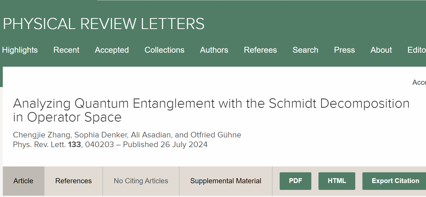 近日,物理科学与技术学院张成杰教授课题组与德国锡根大学Otfried Gühne教授率领的研究团队携手,在量子纠缠这一前沿领域取得了突破性进展。他们创新性地提出了基于算符空间施密特分解的真多体量子纠缠目击者方法,这一成果不仅超越了传统基于保真度的检测方法,更通过详尽的量子态分析实证了其显著提升量子纠缠检测效能的能力。此项开创性研究,以“Analyzing Quantum Entanglement with the Schmidt Decomposition in Operator Space”(用算符空间中施密特分解分析量子纠缠)为题,荣耀刊登于国际顶尖学术期刊《Physical Review Letters》上,于2024年7月26日正式发布,标志着量子纠缠研究迈向了新的里程碑。