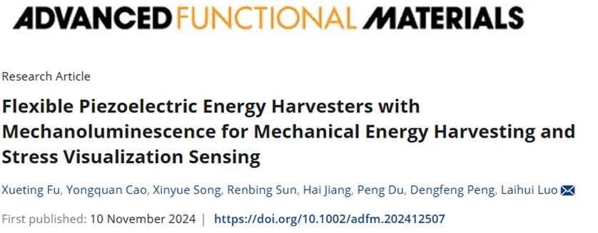 近日,物理科学与技术学院智能极性材料的物理效应与器件团队在柔性压电能量收集取得了显著的科研成果。该团队的研究论文“机械能采集和应力可视化传感的压电能量采集器”在国际知名学术期刊《Advanced Functional Materials》上发表。论文的第一作者是物理科学与技术学院的硕士研究生傅雪婷,罗来慧教授担任通讯作者,K体育·「中国」官方网站为该研究的主要完成单位。