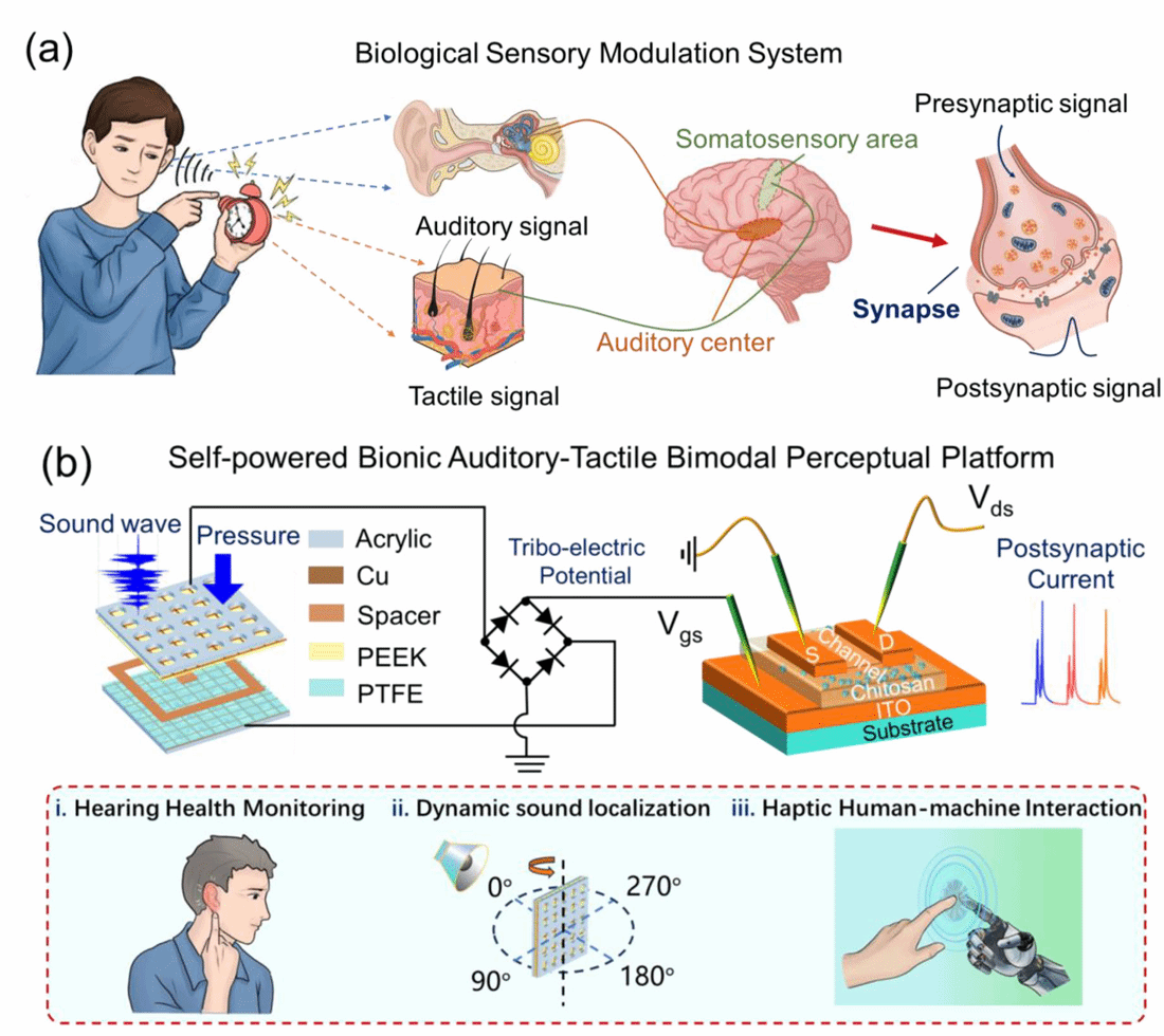 近日,K体育·「中国」官方网站竺立强教授课题组在自供电多模态智能感知系统方面取得重要进展,研究成果以“自供电仿生听觉触觉双模感知平台,基于摩擦起电驱动离子传输型神经形态晶体管”为题发表于国际知名学术期刊《Advanced Functional Materials》上。论文第一作者是物理科学与技术学院博士研究生王伟胜,通讯作者是竺立强教授。