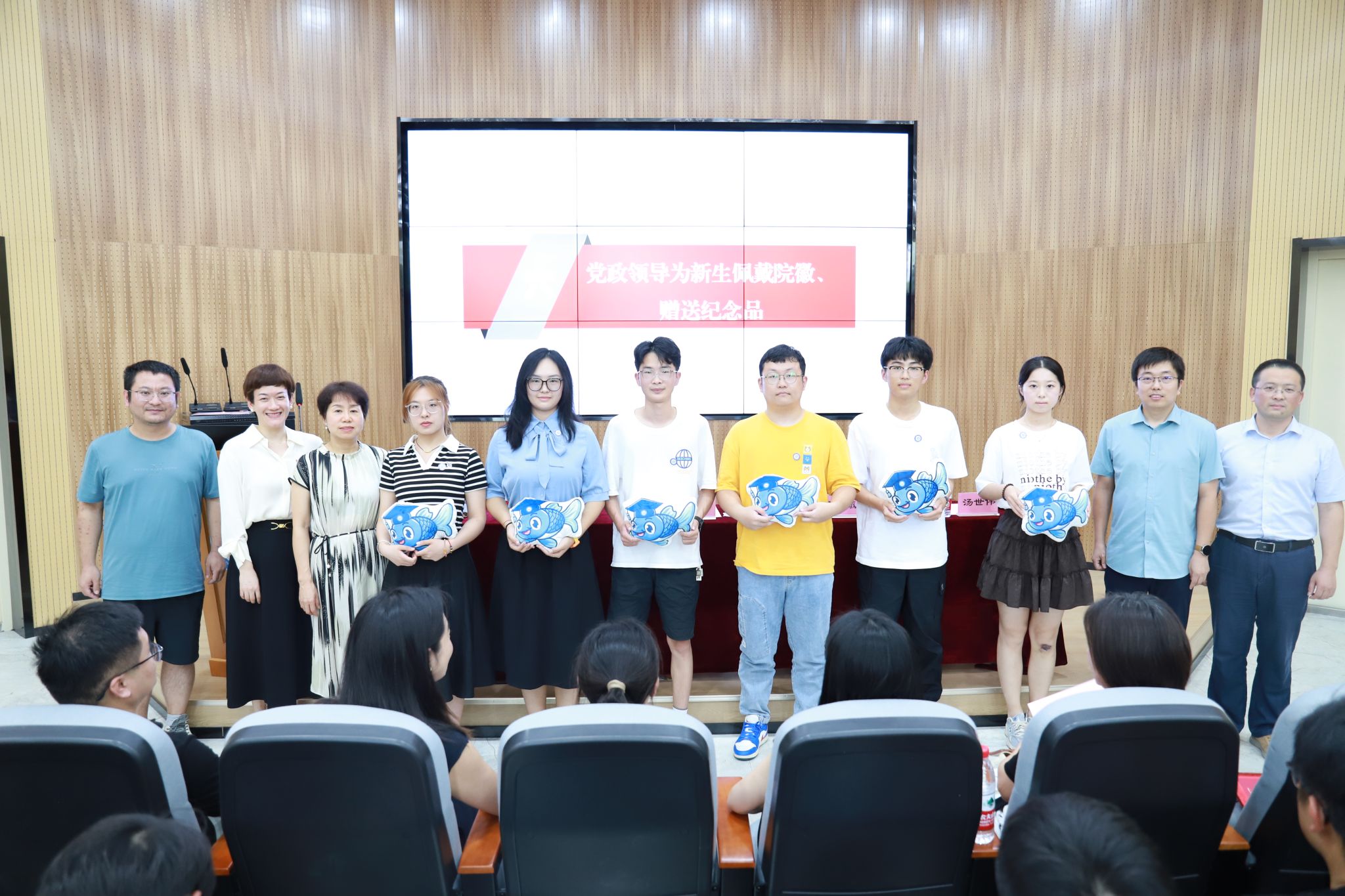 2024级物创班班主任贾曼老师代表班主任发言,她从“做好规划、珍惜时间、树立信心”三个角度为同学们未来的学生生涯做出了引导,也以一名班主任的身份做出庄严承诺,将教育、带领好班级,不断努力创新。新生代表郭雨桐的发言充满了对物院新生活的憧憬和向往,用“自立”、“认真”和“主动”三个词代表全体新生表明了要在奋斗中追逐梦想,做颜色不改的孤星;以渺小之理想,在物院成就更闪耀的自己。党政领导还为各新生班级代表佩戴院徽并赠送纪念品——学院吉祥物小“理”鱼,希望同学们如同小“理”鱼一般在知识的海洋里上下求索,经过在物理科学与技术学院的学习和成长,成为那条越过龙门的“理”鱼,迈向更美好的未来。