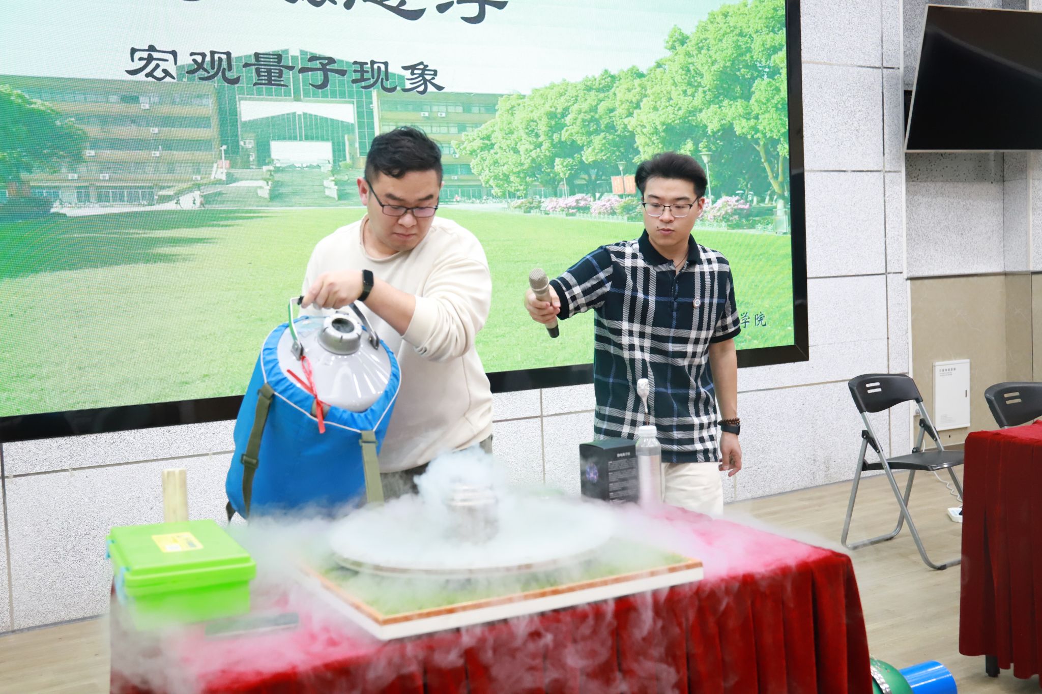 胡绪瑞老师利用物理探索中心超导磁悬浮实验仪器,展示超导磁悬浮现象。在液氮冷却的作用下,金属块与磁性轨道之间出现了明显的超导磁悬浮现象,引起了与会师生的阵阵惊呼,当金属块沿着轨道一圈圈运动起来时,会场的气氛达到了顶峰。