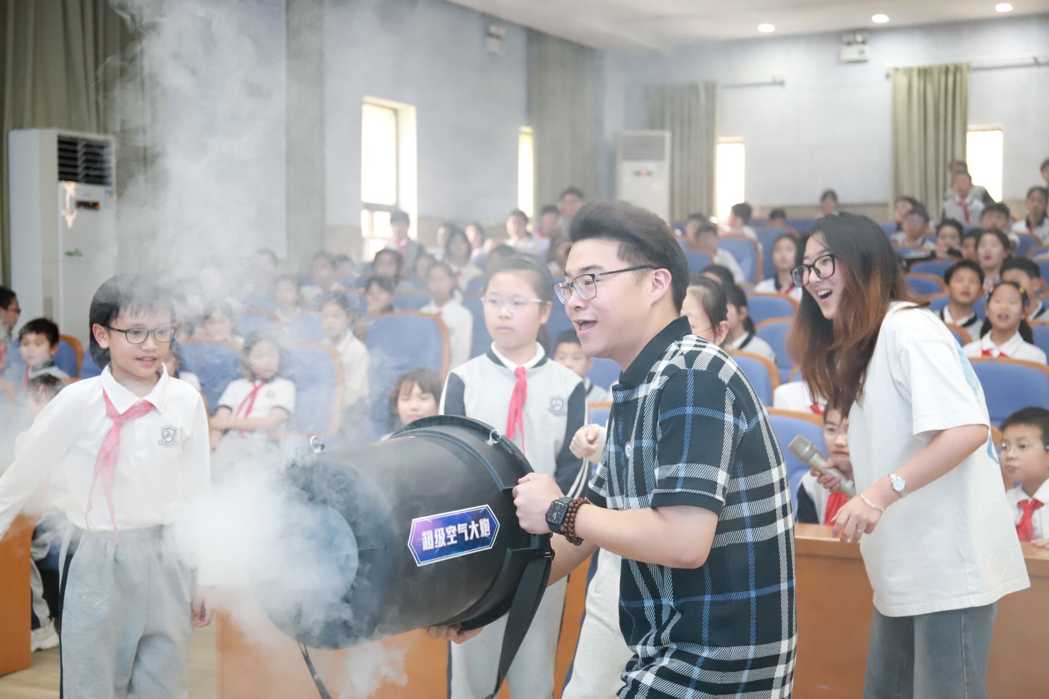 如何通过马德堡半球实验亲身感受大气压力?如何在炫酷的空气炮实验中将风和空气有形化?在启明星宣讲团成员的一番神秘操作下,各式各样的“科技+”沉浸式体验,精彩而又充满未来感的科学现象让孩子们惊叹不已,报告厅里时不时传来阵阵喝彩。