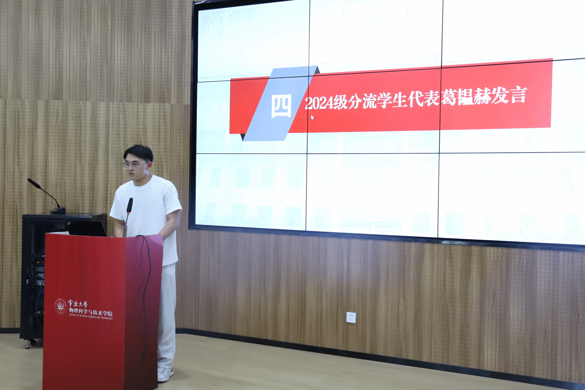 2024级微电子科学与工程专业的葛韫赫则作为分流学生代表发言,他回顾了大一基础学习与竞赛,感恩一年来师长们的关心帮助,他表示自己未来将以热爱勤勉继续探索物理、贡献国家。