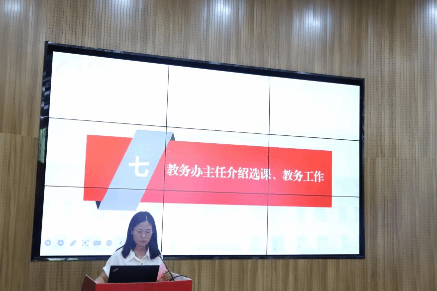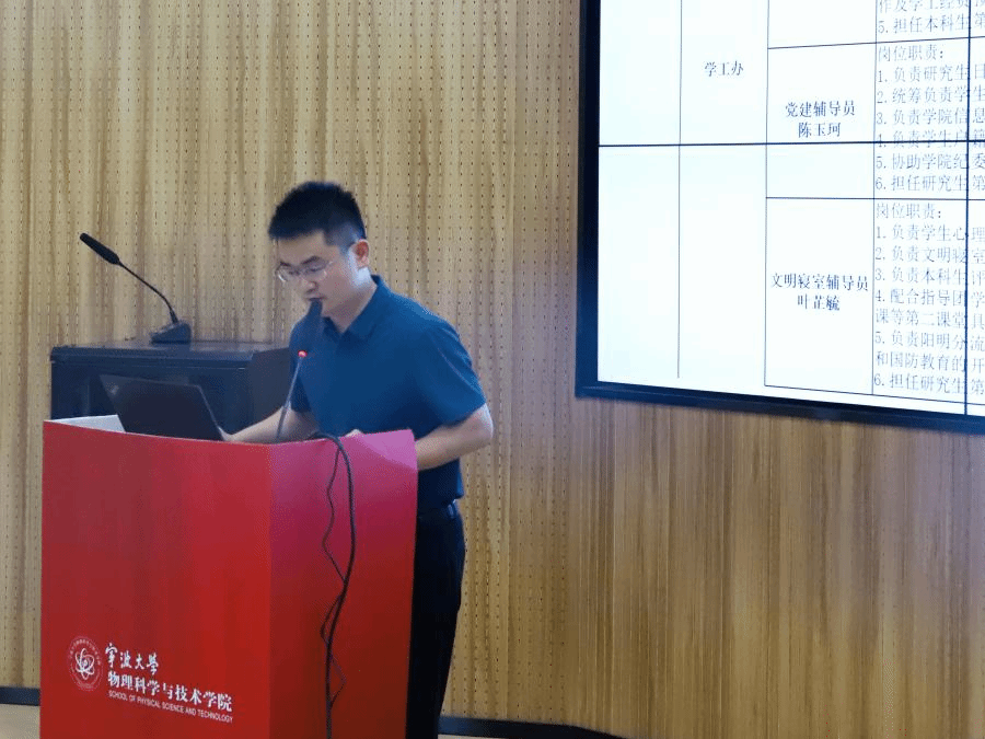 见面会的第二个环节,学院党政办、教务办、学工办代表依次上台,介绍了各自的职责分工并提醒学业生活事项:党政办统筹学院行政事务,负责设备维修申请、党建工作及研究生招生政策咨询;教务办强调选课时间节点与学分修读规则;学工办提供就业指导、寝室管理等服务。希望新同学们及时知晓学院概况,主动与老师们沟通获取支持。